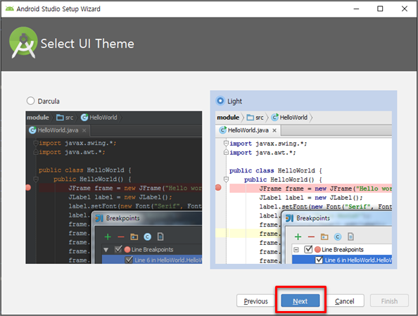 - 안드로이드 스튜디오 테마를 설정하는 절차입니다. 어두운 계열과 밝은 계열이 있습니다.