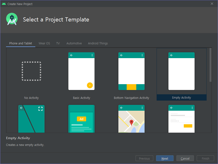 - Android Studio에서 제공하는 기본적인 Template 입니다. Empty Activity를 만들어 진행하겠습니다.