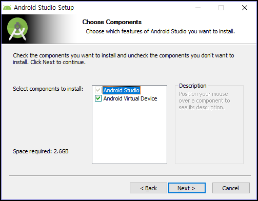 - Android Studio에서 제공하는 에뮬레이터를 사용하기 위해선 Android Virtual Device에 체크해야 합니다.