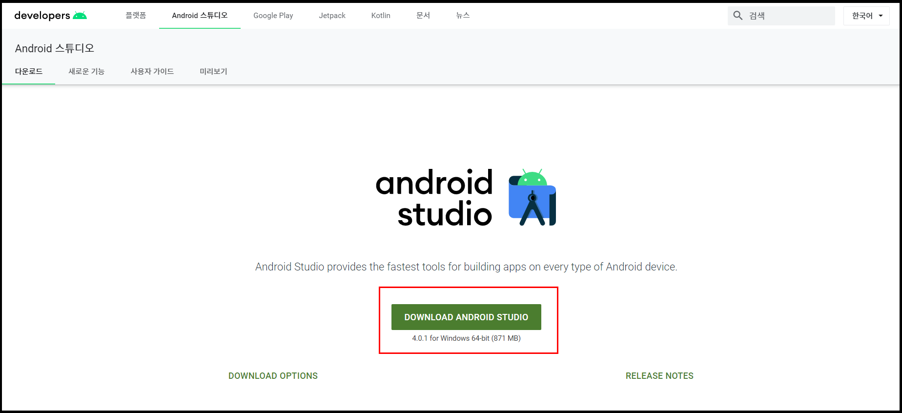 하단의 DOWNLOAD OPTIONS 버튼을 누르면 직접 환경에 맞는 Android Studio를 설치할 수 있습니다.