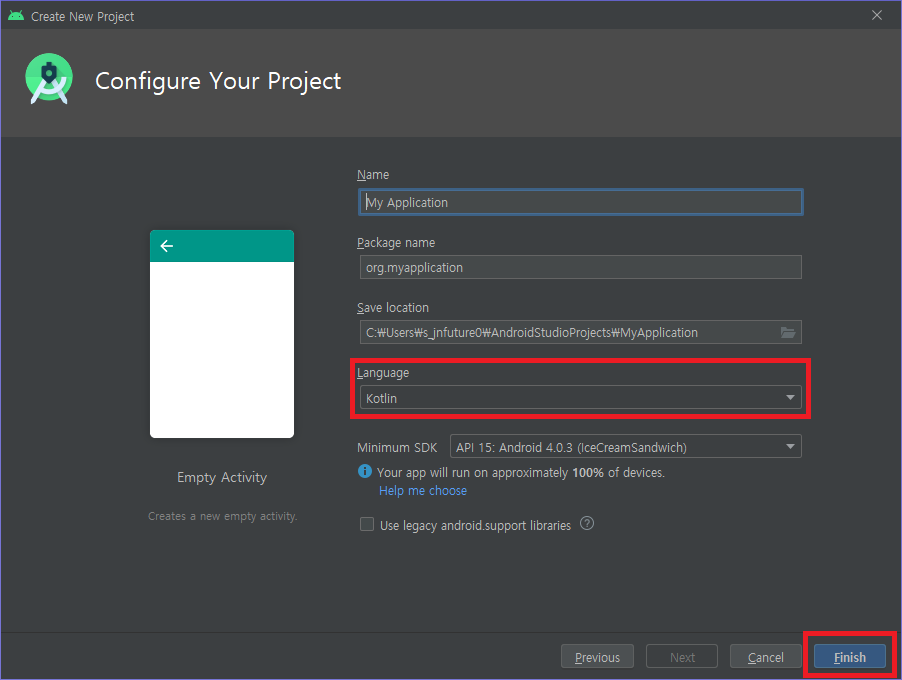 - Project의 이름과 패키지명, 저장할 장소 등을 설정하는 페이지입니다. Finish를 눌러 진행합니다.