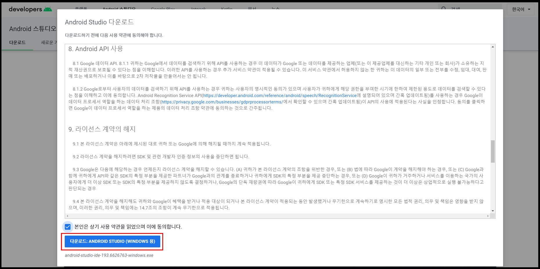 - 약관동의 후 다운로드 버튼을 눌러줍니다.