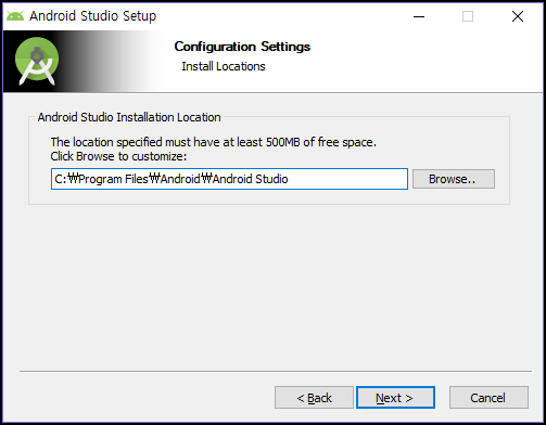 - Android Studio가 설치될 경로를 지정합니다. Next를 눌러 진행합니다.