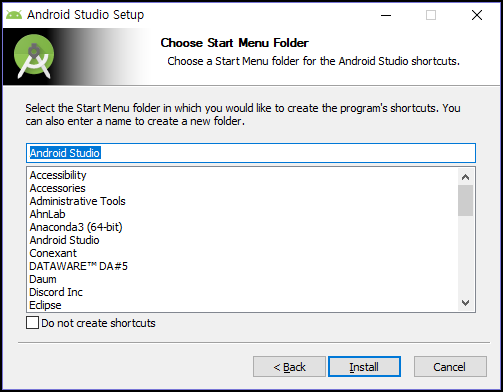 - 시작메뉴에 표시될 폴더 이름을 입력합니다. Install을 눌러 진행합니다.