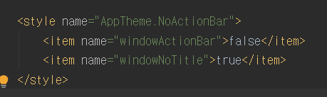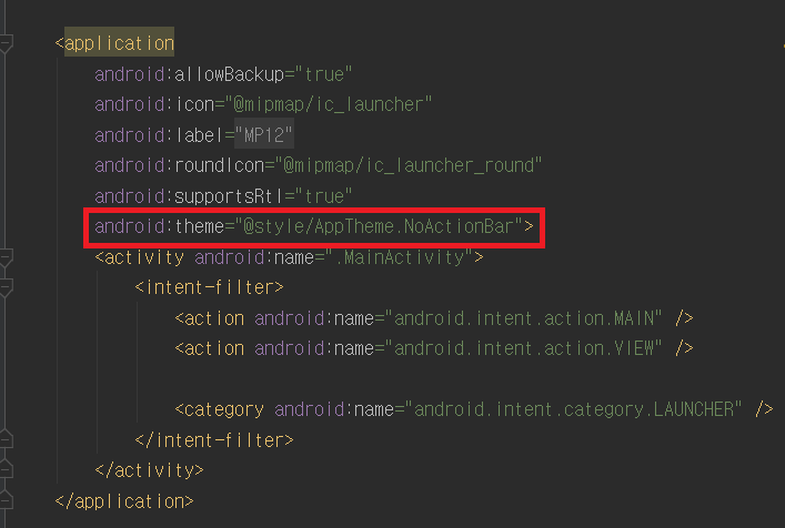 우선 액션바를 따로 사용하지 않을 것이기에 theme를 AppTheme.NoActionBar로 설정해줍니다.