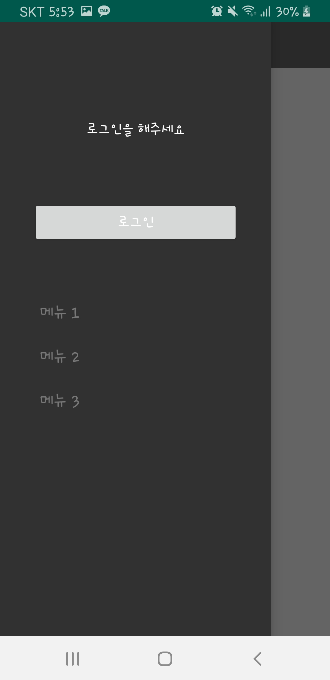 <?xml version="1.0" encoding="utf-8"?> <androidx.drawerlayout.widget.DrawerLayout xmlns:android="http://schemas.android.com/apk/res/android" xmlns:app="http://schemas.android.com/apk/res-auto" xmlns:tools="http://schemas.android.com/tools" android:id="@+id/main_drawer_layout" tools:openDrawer="start" android:fitsSystemWindows="true" android:layout_width="match_parent" android:layout_height="match_parent"> <!--fitsSystemWindows를 true로 지정할 경우 뷰가 차지할 수 있는 영역을 소프트키, 상태바를 제외한 영역까지 넓혀줍니다.--> <include android:layout_width="match_parent" android:layout_height="match_parent" layout="@layout/activity_main"/> <com.google.android.material.navigation.NavigationView android:id="@+id/navigation_view" android:orientation="vertical" android:background="#313131" android:layout_gravity = "left" app:itemTextColor="#fff" android:layout_width="match_parent" android:layout_height="match_parent"> <androidx.constraintlayout.widget.ConstraintLayout android:layout_width="match_parent" android:layout_height="match_parent"> <include android:id="@+id/main_header_include_logged_in" android:visibility="invisible" app:layout_constraintTop_toTopOf="parent" android:layout_width="match_parent" android:layout_height="wrap_content" layout="@layout/main_drawer_header_logged_in"/> <include android:id="@+id/main_header_include_logged_out" android:visibility="visible" app:layout_constraintTop_toTopOf="parent" android:layout_width="match_parent" android:layout_height="wrap_content" layout="@layout/main_drawer_header_logged_out"/> <LinearLayout android:layout_width="match_parent" android:layout_height="wrap_content" app:layout_constraintTop_toBottomOf="@id/main_header_include_logged_in" app:layout_constraintLeft_toLeftOf="parent" android:orientation="vertical"> <Button android:id="@+id/main_navigation_btn1" android:clickable="true" android:enabled="false" android:layout_width="wrap_content" android:layout_height="wrap_content" android:background="#313131" style="?android:attr/borderlessButtonStyle" android:layout_marginLeft="21dp" android:layout_marginTop="20dp" android:text="메뉴 1" android:textSize="18sp" android:textColor="#777777"/> <Button android:id="@+id/main_navigation_btn2" android:clickable="true" android:enabled="false" android:layout_width="wrap_content" android:layout_height="wrap_content" android:background="#313131" style="?android:attr/borderlessButtonStyle" android:layout_marginLeft="21dp" android:text="메뉴 2" android:textSize="18sp" android:textColor="#777777"/> <Button android:id="@+id/main_navigation_btn3" android:clickable="true" android:enabled="false" android:layout_width="wrap_content" android:layout_height="wrap_content" android:background="#313131" style="?android:attr/borderlessButtonStyle" android:layout_marginLeft="21dp" android:text="메뉴 3" android:textSize="18sp" android:textColor="#777777"/> </LinearLayout> </androidx.constraintlayout.widget.ConstraintLayout> </com.google.android.material.navigation.NavigationView> </androidx.drawerlayout.widget.DrawerLayout>