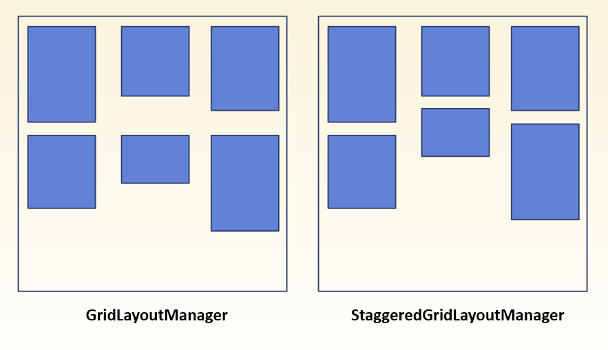GridLayoutManager, StaggeredGridLayoutManager 차이 그림으로 설명하면 이런 느낌입니다.